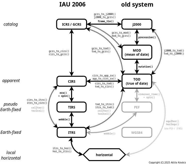 The implementations follow the latest standard for high-precision astrometry as described the IAU 2000 / IAU 2006 and IERS 2010 conventions. See Figure 1 below for an overview of the various coordinate reference systems, and the functions, which can be used to tansform position and/or velocoty vectors among them,